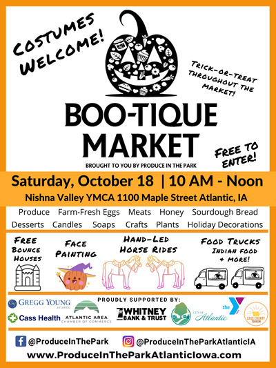 (Atlantic, Iowa) – Organizers with Atlantic’s Produce in the Park have announced the first of five Holiday Market events takes place October 18th at the Nishna Valley YMCA in Atlantic. The “Boo-tique” Market by Produce in the Park will be held from 10-a.m. until Noon on the 18th, at the NV YMCA (1100 Maple St.), in Atlantic. There is no admission fee.