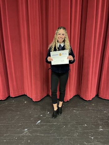 Following presentations by guest speakers, awards were given out. First were those recognized for earning 10,000 FFA points throughout their time as a member. These points are earned through getting involved with our chapter. The more activities and events a member participates in, the more points they earn. Those recognized for reaching 10,000 points included Mia Kloewer, Lola Comes and McKenna Sonntag. The next award was the Academic Achievement Award. The award is given to those who have been a part of the Atlantic FFA chapter for three years, and have maintained a 3.5 GPA or above throughout all those years. Those who received the Academic Achievement Award included Carter Witzman, Lola Comes, Joci Zarbaono, McKenna Sonntag, Mia Kloewer.