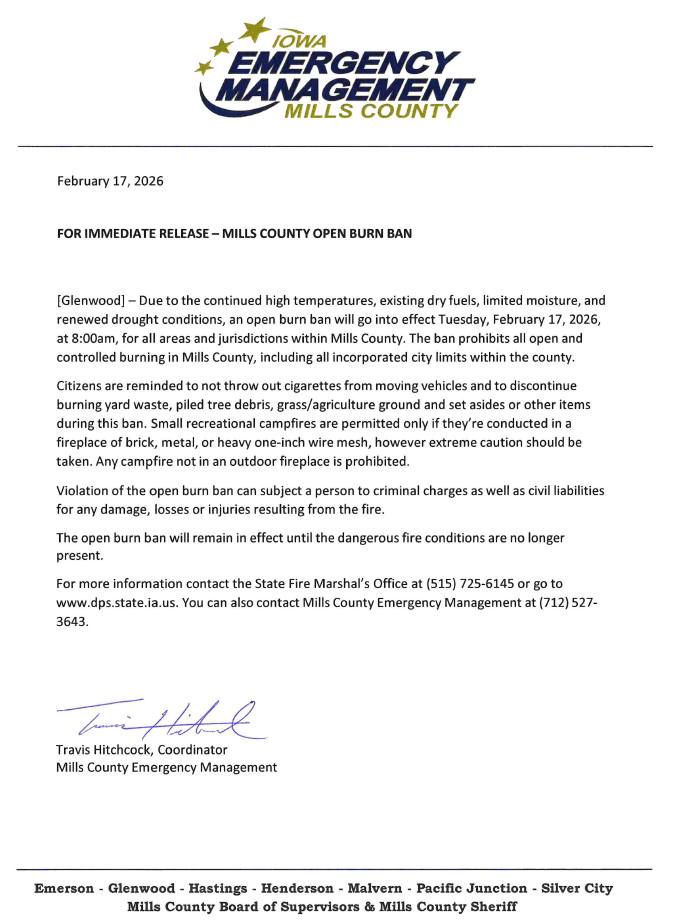 (Glenwood, IA) – The Mills County Emergency Management Agency reports a BURN BAN is now in effect, and until further notice. The ban is in-place due to the continued high temperatures, existing dry fuels, limited moisture, and renewed drought conditions. The BURN BAN is in effect for all areas and jurisdictions within Mills County. The ban prohibits ALL open and controlled burning in Mills County, including all incorporated city limits within the County. For more information, see the attached notification: