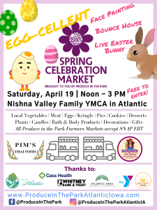 ATLANTIC, IA (April 7, 2025) – Produce in the Park’s “EGG-cellent Spring Celebration Market” is all about farm-fresh eggs. Spring Celebration Market will be held at the Nishna Valley Family YMCA (1100 Maple St. Atlantic, IA 50022) on Saturday, April 19 from noon to 3:00 PM. Market visitors will find farm-fresh egg vendors, a 4-H poultry exhibitor sharing information and offering a free egg art craft, and Cass Health Dietitian Sarah Andersen sharing information on the benefits and nutrients of eggs, as well as different ways to prepare this versatile food. Cass County Extension will be sharing information on raising chickens, and Sarah Selders will be offering Easter-themed face painting–which of course will feature Easter eggs.