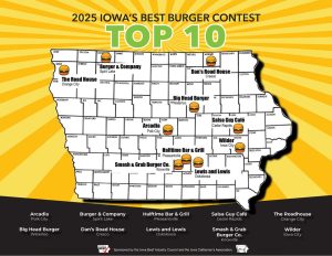 The final phase of the contest begins soon, as a panel of anonymous judges will visit each Top Ten restaurant to evaluate the burgers based on taste, appearance, and proper doneness (160°F). The 2025 Iowa’s Best Burger winner will be announced on May 1 to kick off May Beef Month.