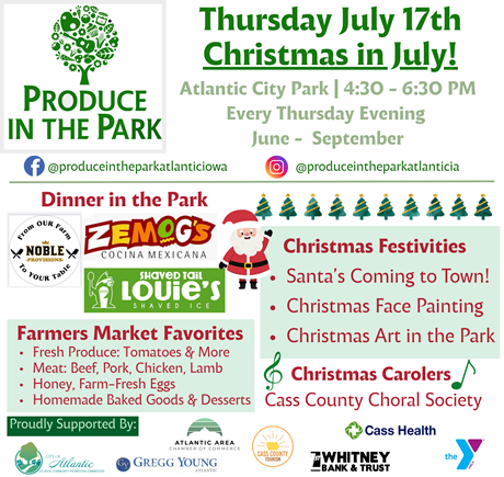(Atlantic, Iowa) – The downtown Atlantic City Park is a magical place to celebrate Christmas…in July! Event organizers invite your join them at the farmers market for Christmas in July, featuring festive fun for all ages: Christmas face painting, holiday-themed art with Your Forte, a special visit from Santa, and a performance of Christmas carols by the Cass County Choral Society. Don’t miss this jolly good time at the park!