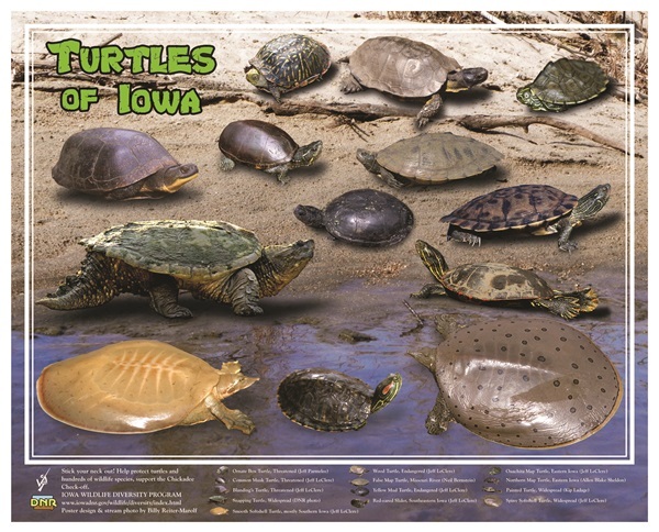 Iowa is home to 13 turtle species; western painted turtle, snapping turtle, midland smooth softshell turtle, eastern spiny softshell turtle, red-eared slider, northern map turtle, Ouachita map turtle, northern false map turtle, ornate box turtle, Blanding’s turtle, wood turtle, eastern musk turtle, and yellow mud turtle.