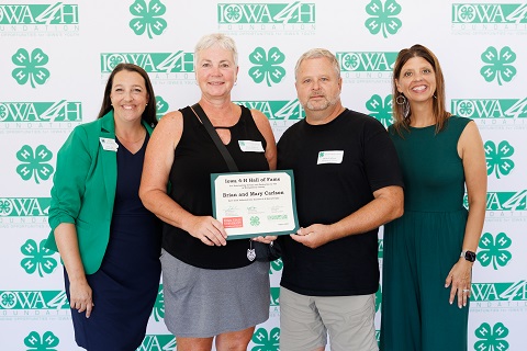 (Des Moines, Iowa) – Officials with the Montgomery County ISU Extension and Outreach office report Brian and Mary Carlson, of Montgomery County, were inducted into the 2025 Iowa 4-H Hall of Fame during a ceremony at the 4-H Exhibits Building at the Iowa State Fair on Sunday, Aug. 17. Ninety-two Iowa counties participated this year and selected 122 inductees for their outstanding service and dedication to 4-H. Inductees or their surviving family members were presented a certificate by the Iowa 4H Foundation President, Don Timmins, and State 4-H Program Leader, Mitchell Hoyer, as they were introduced on stage.