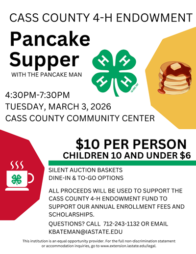 For more information on the Pancake Supper, Cass County 4-H Endowment or how to join 4-H, contact Katie Bateman, Cass County Youth Coordinator, at 712-243-1132 or kbateman@iastate.edu.