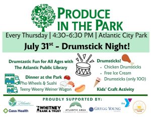 Food Trucks on site include : Pho Wheels and Sushi, and the Teeny Weeny Weiner Wagon. Kids’ craft activity, accordion tunes, and Visiting organizations: Healthy Cass County, Cass Health, Atlantic Kiwanis, and more!