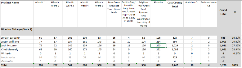 The recount was conducted on November 17, 2025, by the county auditor’s staff and precinct election officials. Ballots from eight Cass County precincts, absentee ballots, and ballots cast in Pottawattamie and Audubon Counties for Atlantic School District Director At-Large were included in the recount. The recount used the same machines that were used on election night.