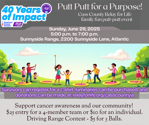 ATLANTIC- Cass County Relay For Life is hosting a Putt-Putt for a Purpose, a family fun event at Sunnyside Range in Atlantic on Sunday, June 29th from 5:00 p.m. to 7:00 p.m. Everyone is invited to come play a round of putt-putt for $25 for a 4-member team or $10 for an individual. The fun will also include a driving range contest for $5 for 3 balls. Prizes