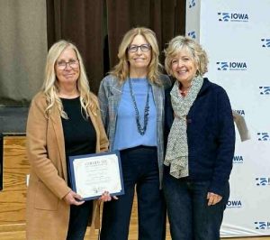 Receiving Robert Nelson’s award from Iowa Democratic Party chair, Rita Hart, (center) are two of his nieces Jodi Wellendorf (left) and Lori Larsen (right).