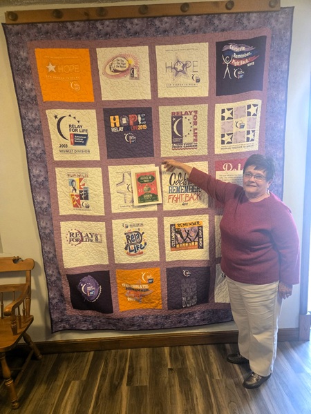 (A Relay for Life Quilt that will be one of the raffle items at Festival. Committee member Rita Rohde is shown with the quilt.)