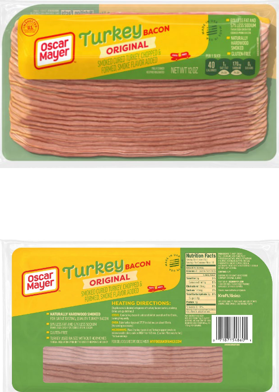 36-oz. packages containing three 12-oz. vacuum-packed packages of “Oscar Mayer Turkey BACON ORIGINAL” and universal product code (UPC) “071871548748” printed on the packaging under the barcode, “use by” dates ranging “23 JUL 2025” to “04 SEP 2025,” and lot codes “RS19,” “RS40,” or “RS42.”