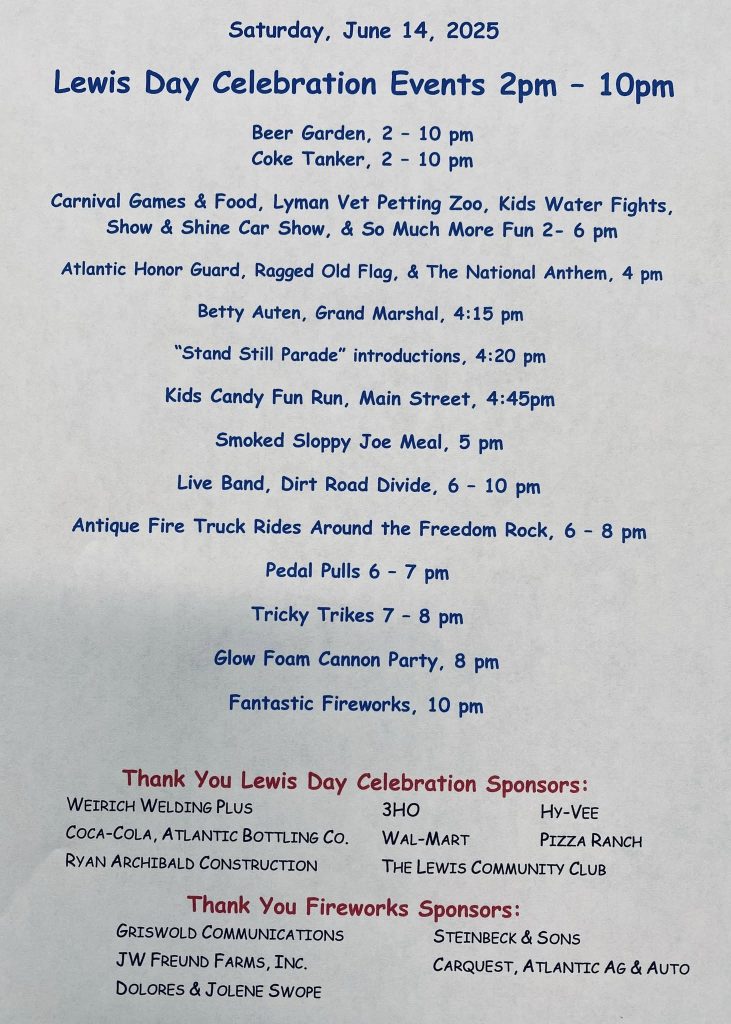 There are antique firetruck rides around the Lewis Freedom Rock, a car show-and-shine, music, and fireworks at dusk. Grand Marshall for the event is long-time community supporter, Betty Auten.