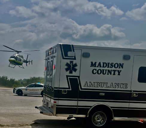 Responding Sheriff’s Deputies and Paramedics with the Madison County Ambulance discovered that a 37-year-old adult male had been critically injured while operating machinery used in the installation of fiber optics. Due to the severity of his injuries, he was flown from the scene by air ambulance to a Des Moines hospital where he underwent emergency surgery.