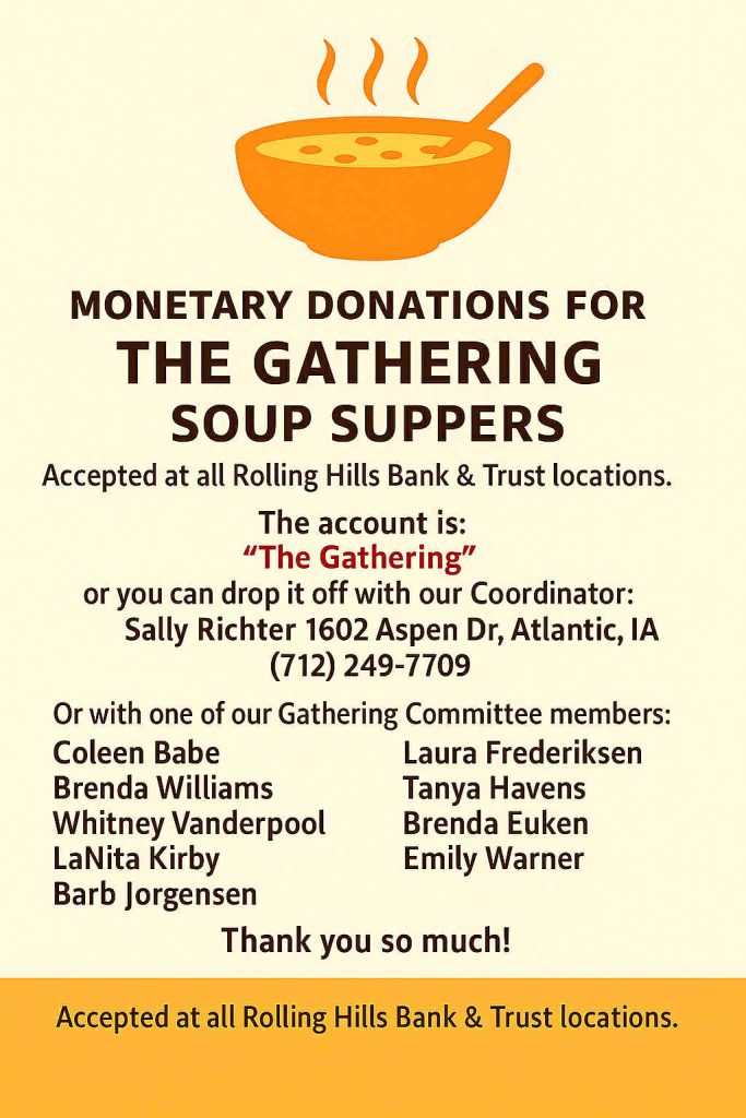 Instead, monetary donations are being accepted in advance to help offset the cost of the meals. Donations are being accepted at all Rolling Hills Band & Trust locations. The account is “The Gathering,” or, you can drop your donation off to Coordinator Sally Richter, at 1602 Aspen Drive, in Atlantic. (Call 712-249-7709 before you stop by). You can also submit your donation to any of the following Gathering Committee members:
