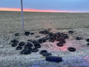 (Harlan, Iowa) – The Shelby County Sheriff’s Office posted on social media this (Tuesday) morning, another incident of illegal tire dumping has taken place. A photo showed more than three dozen tires were dumped Monday night or early this (Tuesday) morning, near the intersection of Shelby County roads M-16 and 850th Street.