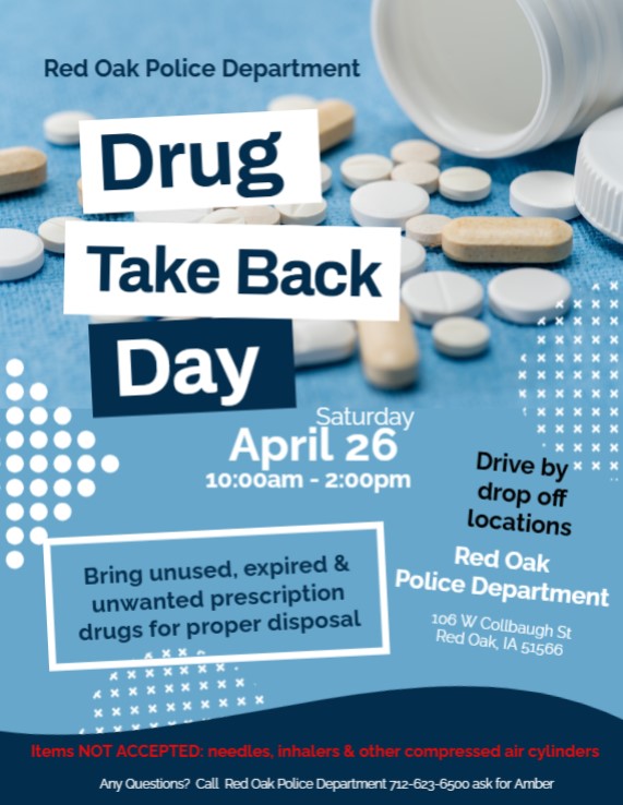 Red Oak, IA – Officials with the Red Oak Police Department report, that on Saturday, April 26th, from 10 a.m. to 2 p.m., the Red Oak Police Department and the Drug Enforcement Administration will host DEA’s National Prescription Drug Take Back Day at locations across the country. DEA and its partners will collect tablets, capsules, patches, and other solid forms of prescription drugs. For more than a decade, the event has helped Americans easily rid their homes of unneeded medications—those that are old, unwanted, or expired—that too often become a gateway to addiction. Take Back Day offers free and anonymous disposal of unneeded medications at close to 5,000 local drop-off locations nationwide.