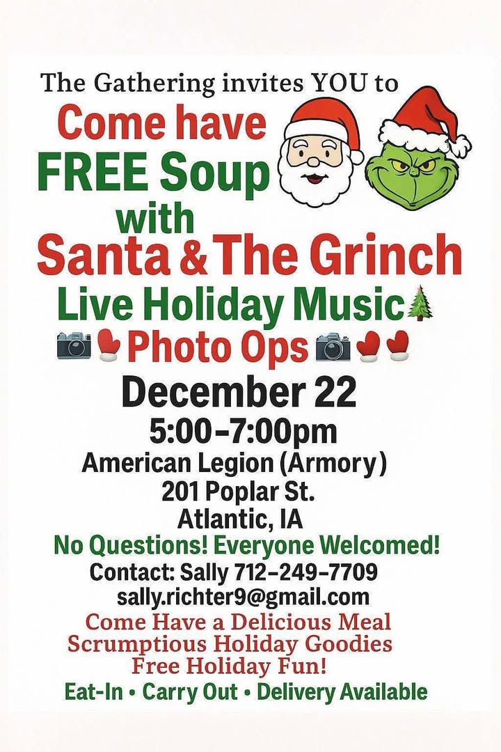 (Atlantic, IA) – You’re invited to enjoy free soup and goodies with Santa and The Grinch, Dec. 22nd, in Atlantic. Enjoy live holiday music while you warm-up with the soup meal, served by volunteers. There will also be opportunities to take pictures. The event, sponsored by Cass Health, will be held at the American Legion Building (The Armory), at 201 Poplar Street, in Atlantic, on Dec. 22nd, from 5-until 7-p.m. Everyone is welcome to attend. Eat-in or take-out! Delivery is also available by making arrangements in advance. Contact Sally Madsen-Richter a 712-249-7709 with any questions you may have, or to schedule delivery. (You may also e-mail Sally at sally.richter9@gmail.com)
