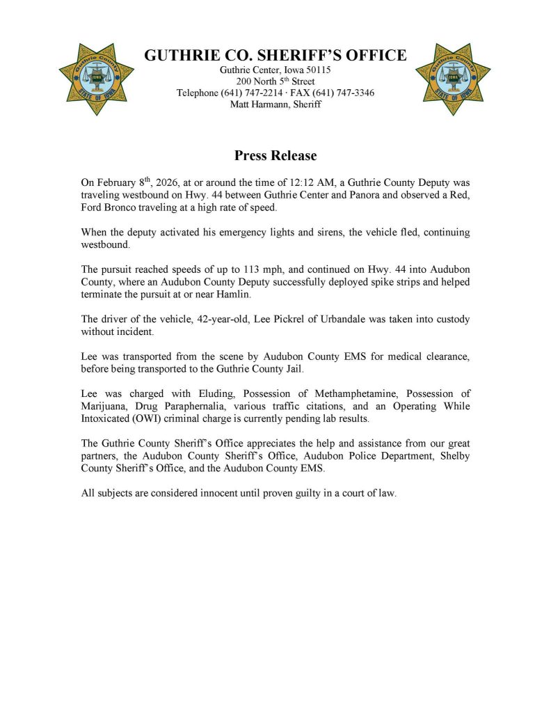 (Guthrie County, IA) – The Guthrie County Sheriff’s Office, today (Monday) released information with regard to a high-speed pursuit Sunday, and the arrest of a man from Urbandale: