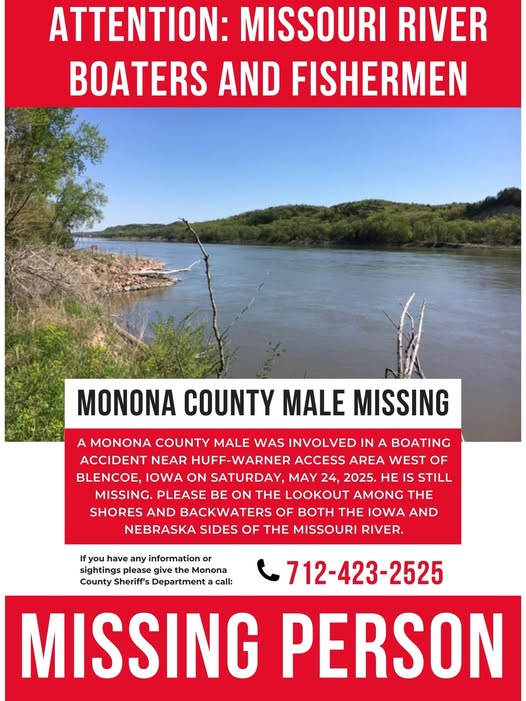 (Onawa, Iowa) – Boaters and anglers along the Missouri River in both Iowa and Nebraska, are being asked by law enforcement to be on the lookout on the shores and backwaters, for a missing boater. The Monona County Sheriff’s Office posted a notice on social media Wednesday (June 11th), with regard to a Monona County man who was involved in a boating accident May 24th, and is still missing. Anyone seeing articles of clothing or other evidence of the missing boater – whose name was not released – is asked to contact the Monona County Sheriff’s Office at 712-423-2525.