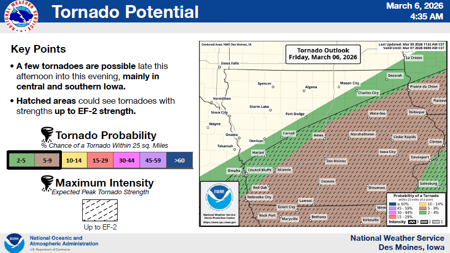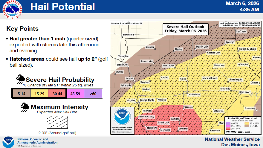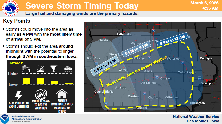 * WHERE – Severe weather possible for much of the area with the highest risk in southwest Iowa.
