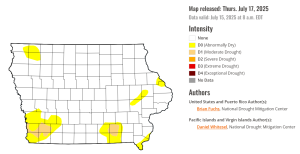 “Seeing them completely remove all of the moderate drought designation really is encouraging, especially for that area, because you know, they’ve just kind of been battered with drier weather compared to the rest of the state,” she says. “And southwest Iowa kind of continues in a very similar dry pattern.” McIntyre issued a “drought watch” for that southwest areas. She says things are a lot better as we head into the last half of July compared to where we were in January. “Most of the state I don’t have any concern as far as drought or abnormally dry conditions. But again, I’ll just can’t kind of keep my eye on that southwest corner and even in the southeast portion of the state, there’s a little bit of moderate drought, so I’ll be keeping my eye on those,” McIntyre says.