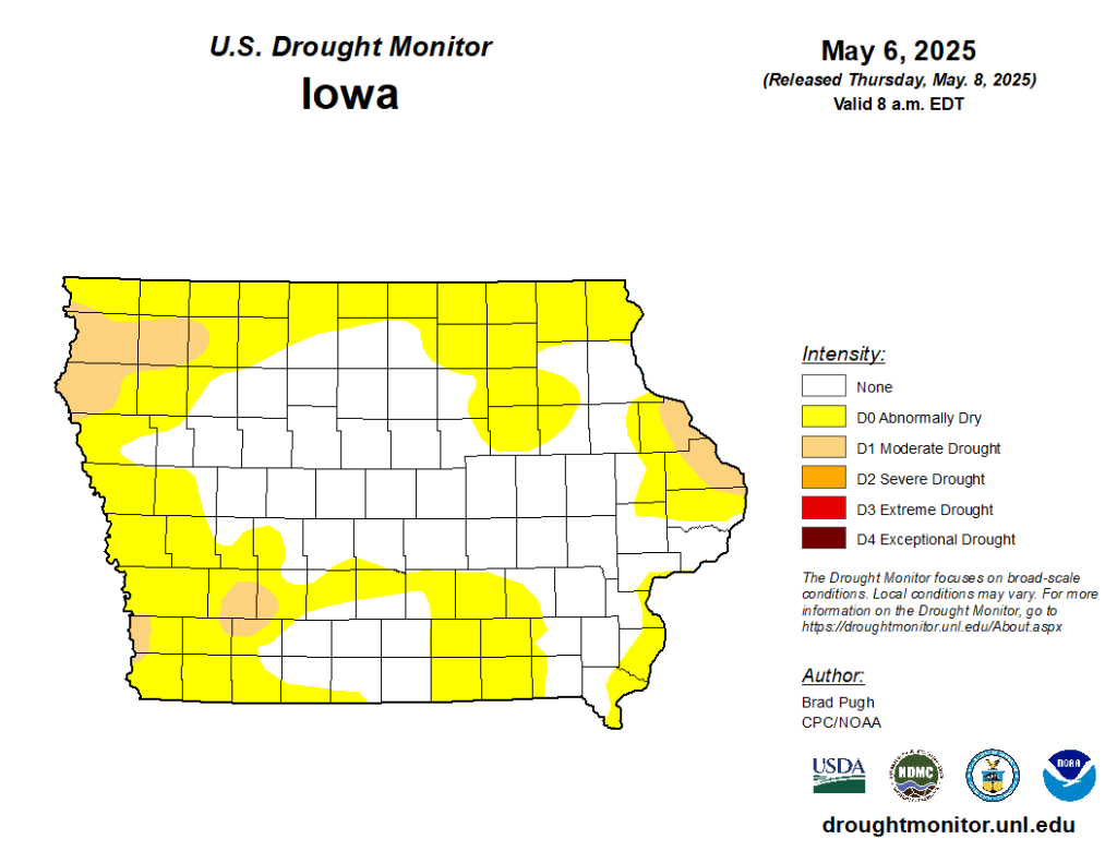According to the U.S. Drought Monitor (USDM), just over half of Iowa continues to experience abnormally dry conditions or drought conditions. The May precipitation outlook from the National Weather Service’s Climate Prediction Center indicates a chance of below-average precipitation across the northeast and eastern half of the state, and an equal chance for above, below, or near-average precipitation for the rest of the state. Reduced rainfall in May could raise concerns about deteriorating conditions.